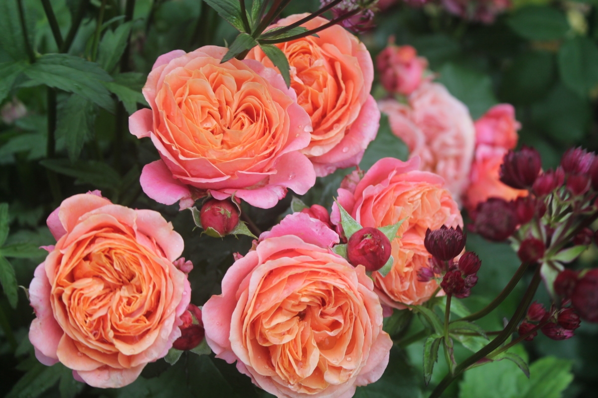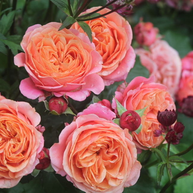 Цветки оранжевые с красноватыми тонами на внешних лепестках, чашевидные, часто квартированные. Побеги сильные, жесткие, прямостоячие, умеренно колючие. Листва блестящая, молодая - темно-красная. Аромат приятный, сладкий и фруктовый.