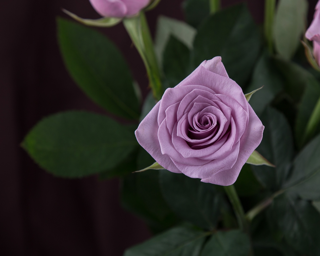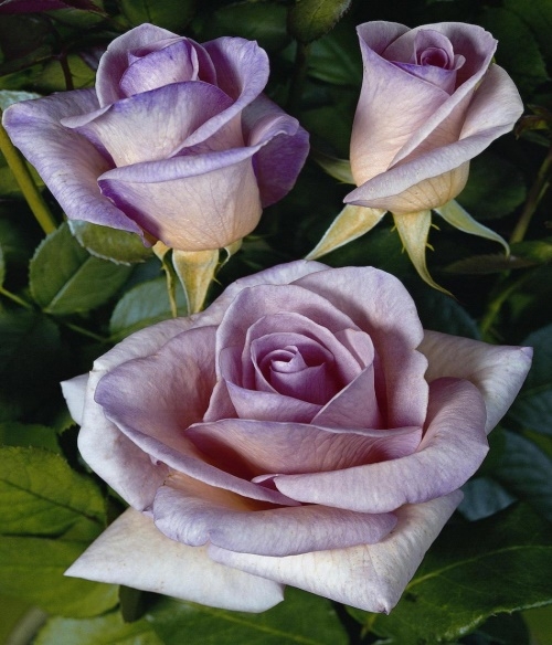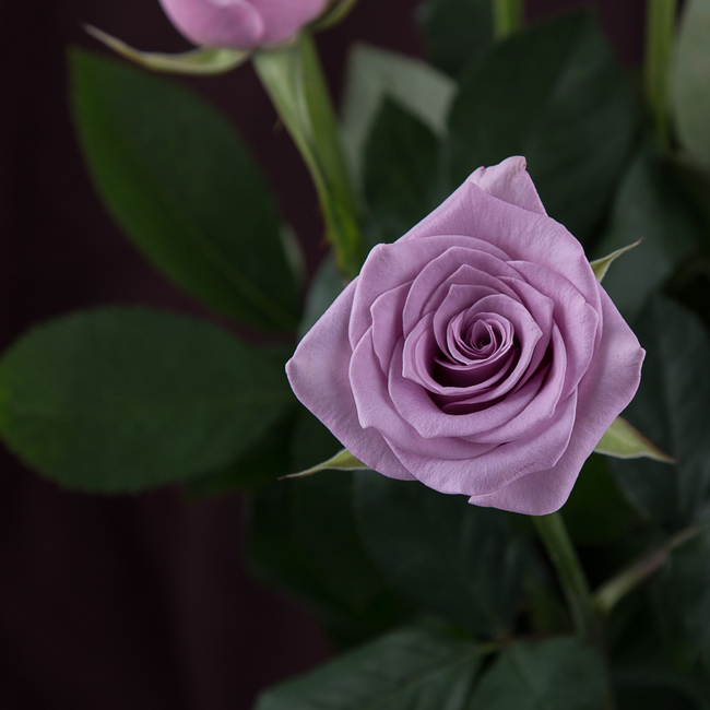 Бутоны роз окрашены в лавандовые оттенки, могут иметь разную степень насыщенности, 60 лепестков, обладают четко выраженной геометрией. Как листва, так и стебель являются насыщенно-зелеными.