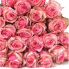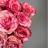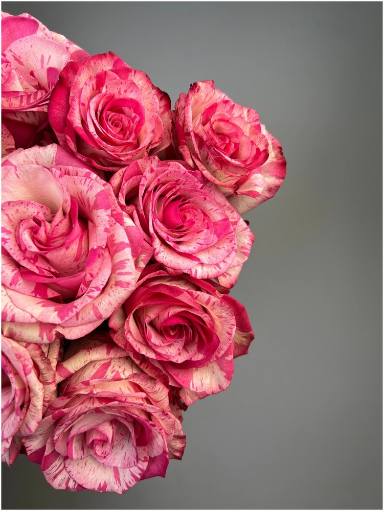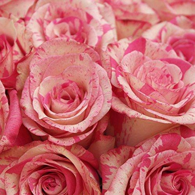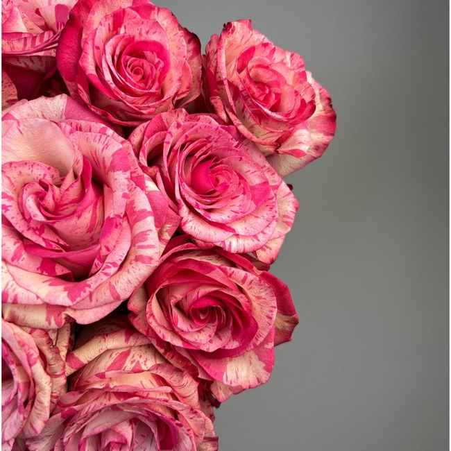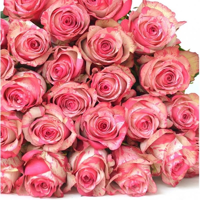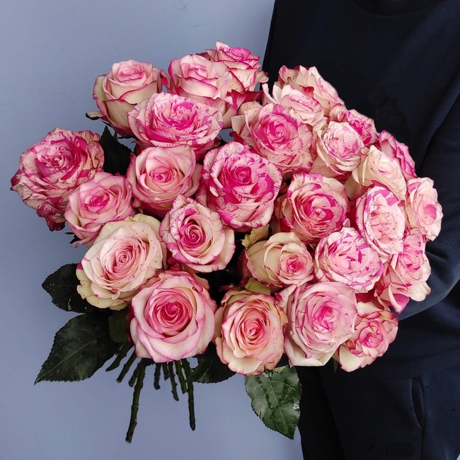 Цветки белые с розовыми прожилками. Бутон довольно крупный, густомахровый классической формы. Цветок данного сорта, благодаря окраске, похож на редкого леопарда розового цвета.