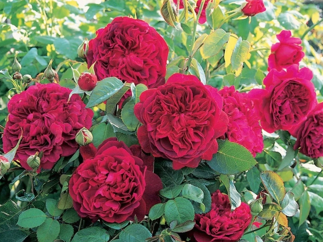 Цвет красный. Сильный, сладкий аромат аниса, малины, клубники. Цветок густо набитый, квартированный от 75 до 100 лепестков, ностальгической формы. Цветет в течение всего сезона, устойчив к жаре. Листва крупная, полуглянцевая.