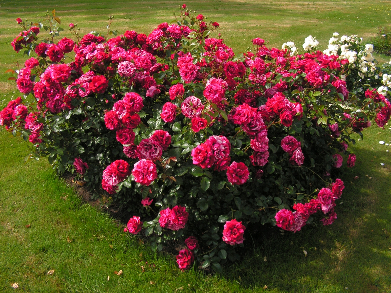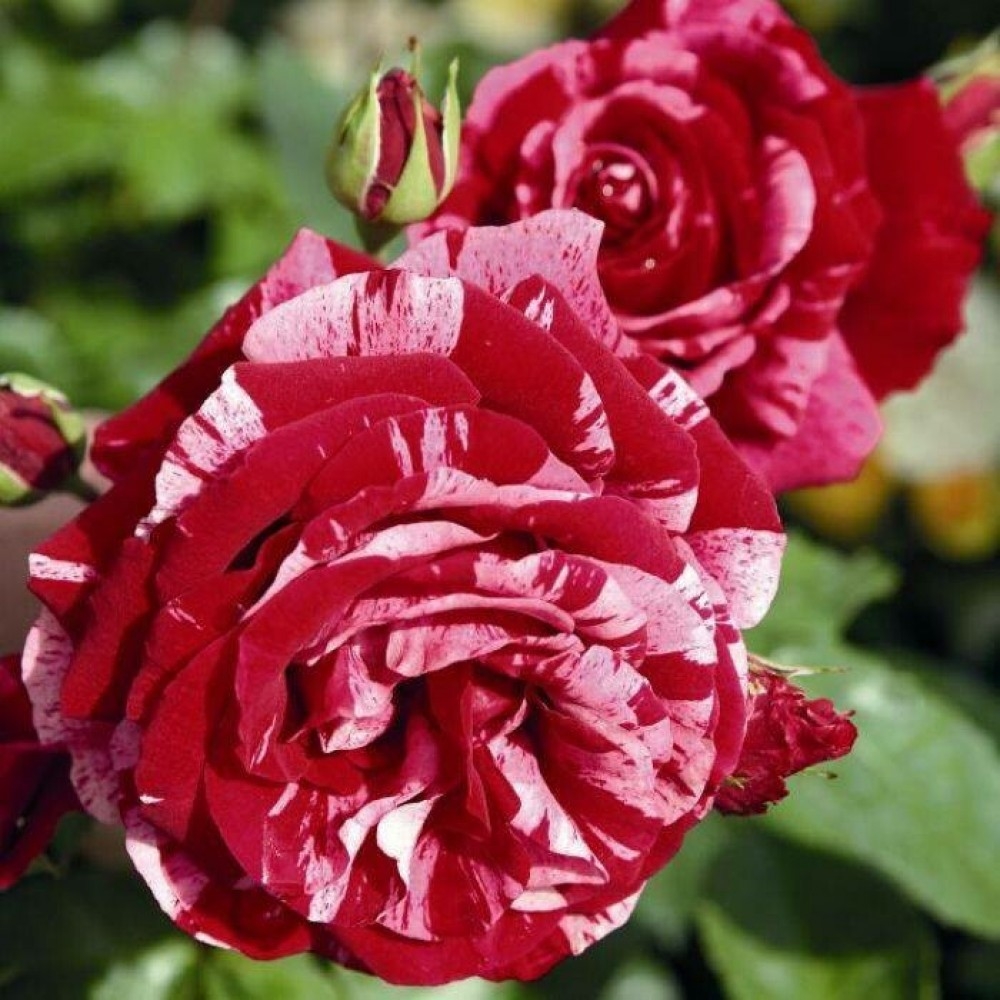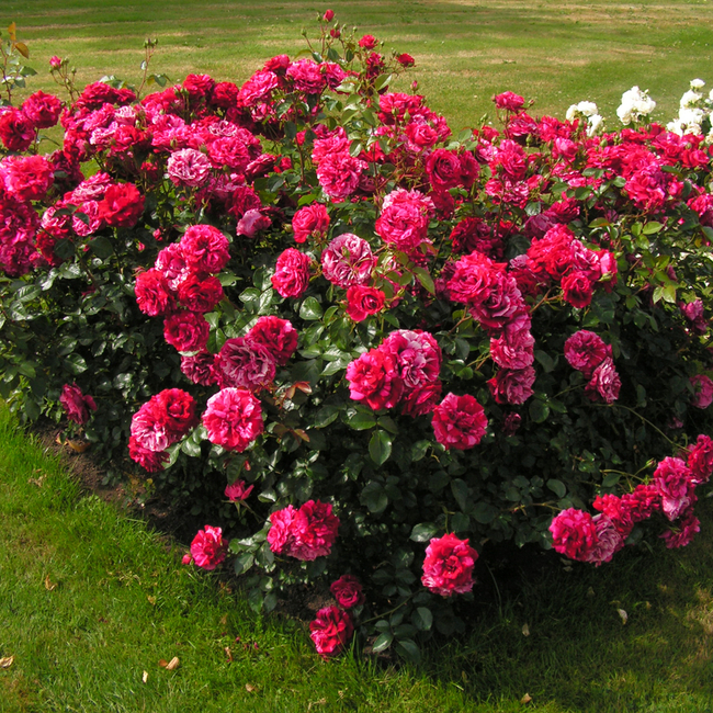 Замечательная новинка, ценная благодаря своей уникальной окраске. Цветки темно-красные с розовыми штрихами и полосками. Куст густой, ветвистый, округлой формы. Активно нарастает начиная со второго года после посадки. Листва темно-зеленая, блестящая. Легкий аромат малины.