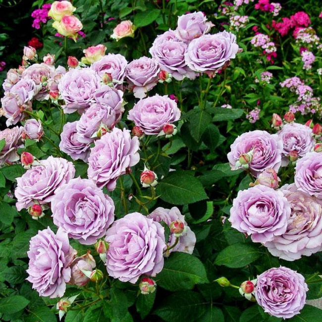 Невероятно крупный бутон с большим количеством лепестков (до сорока) голубого цвета. Эти гигантские флорибунды расцветают на кусте небольшими группами, каждая группа по своей форме напоминает чашу, а каждый цветок похож на розетку. В течение всего сезона на раскидистом кусте появляется много роз, их цветение обильно и волнообразно.