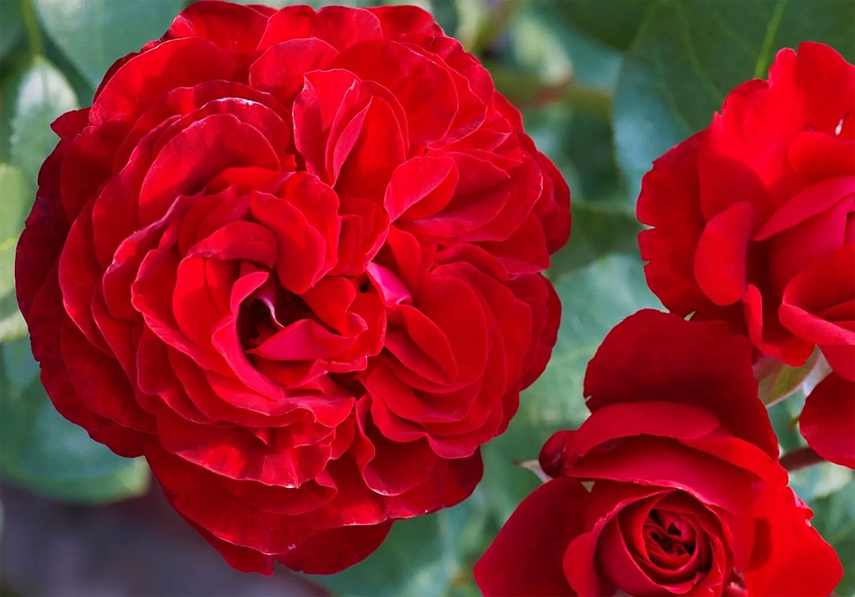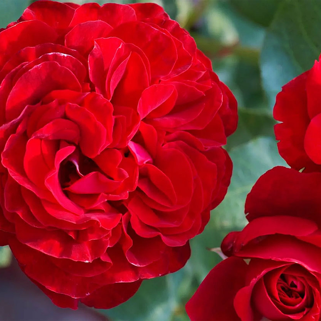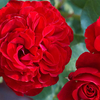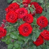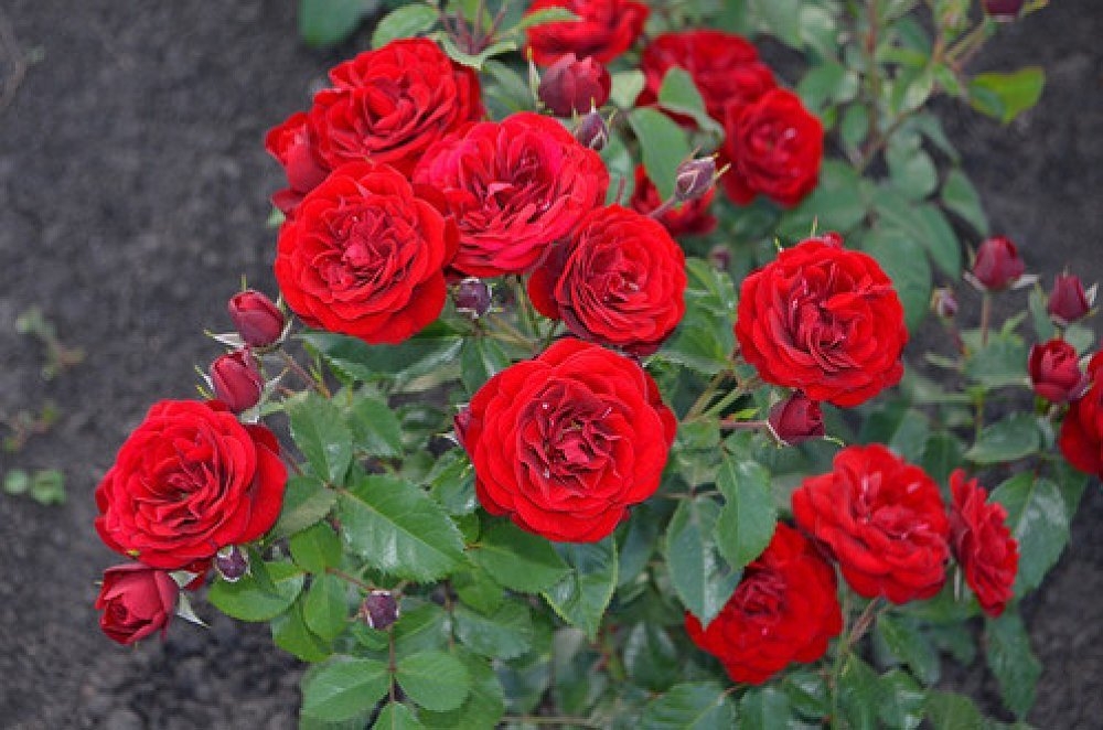 Эта яркая обильноцветущая роза цветет крупными кистями полумахровых цветков, которые появляются на коротких жестких побегах на ветвистом прямостоячем кусте. Цветки оранжево-красные, темные, яркие, чашевидной формы, с золотыми тычинками в центре. Аромат почти отсутствует.