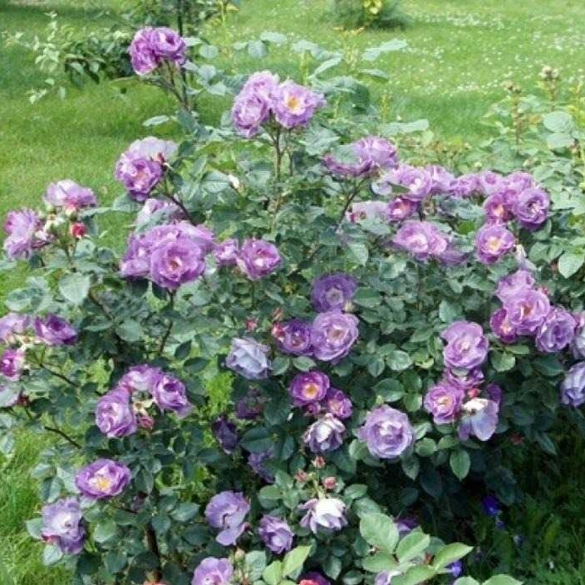 Цветки полумахровые, диаметром 6 — 9 см, содержат в себе более 20 лепестков, распределены по кусту равномерно. Форма цветков изменяется в процессе цветения от конического бутона до плоскочашевидной. Розы сиренево-голубого цвета с белой открытой серединкой и золотисто-желтыми тычинками. Цветки собраны в кисти, состоящие из 3 — 7 бутонов.