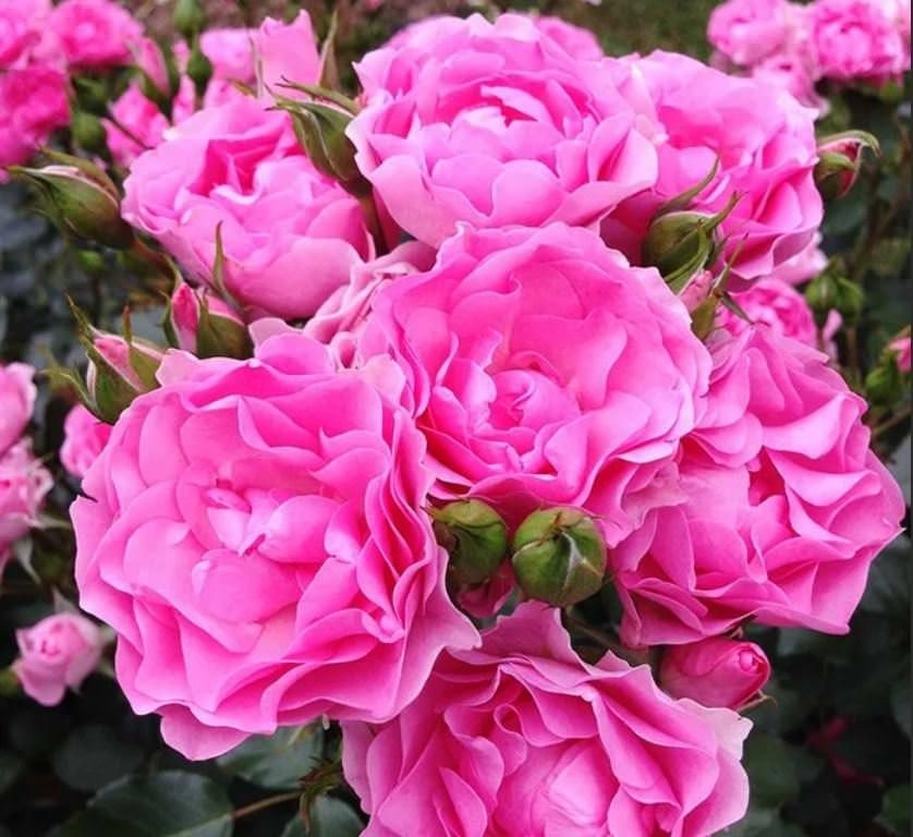 Розовые чашевидные цветы с волнистыми лепестками распускаются в больших соцветиях. Аромат легкий. Долго не увядают, устойчивы к дождю. Кусты прямостоячие, с крупными темно-зелеными листьями.