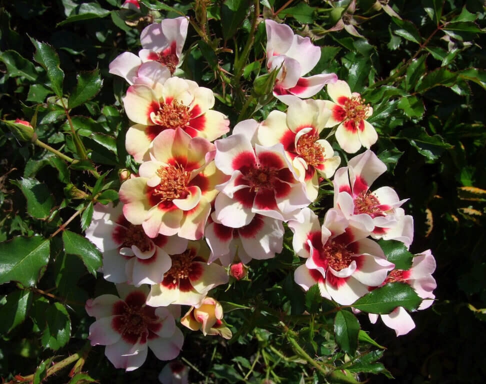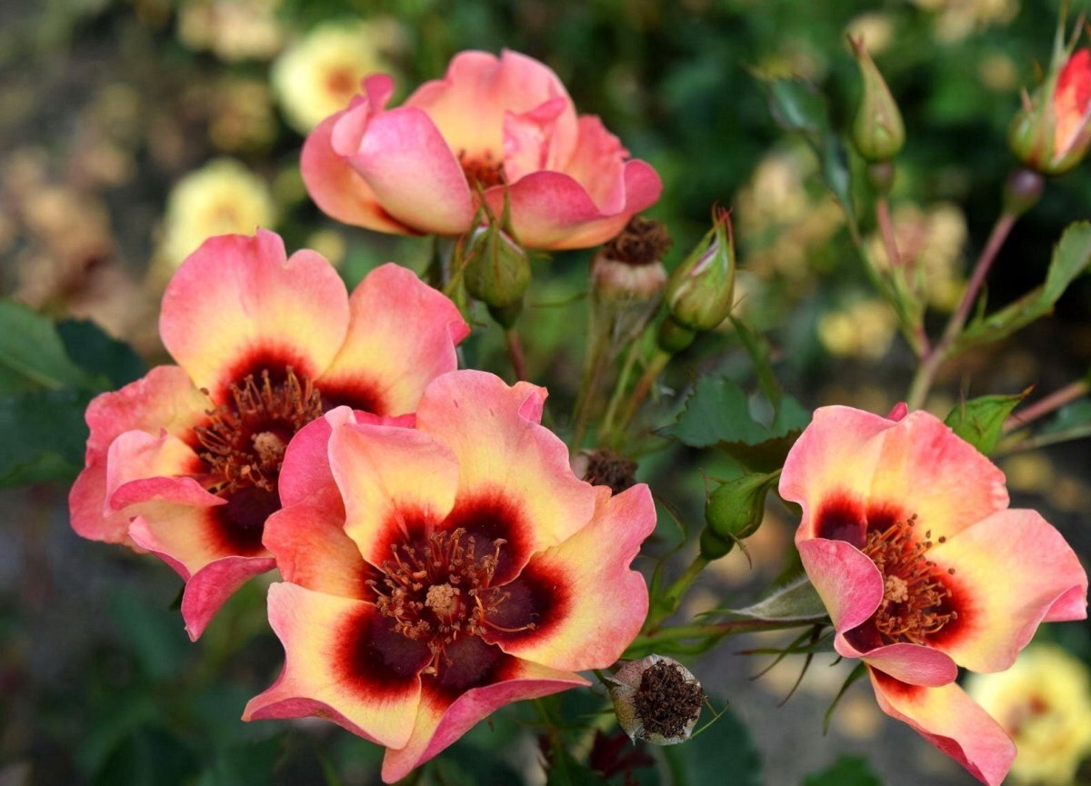 Сортосерия «Babylon Eyes». Цветки диаметром 6 см, простые (4-8 лепестков), персиковые с тёмно-красным базальным пятном в основании лепестков. Тональность цветков в процессе цветения меняется. Цветение обильное, повторное в течение сезона. Листва устойчивая к заболеваниям. Куст компактный, высотой 50-70 см.
