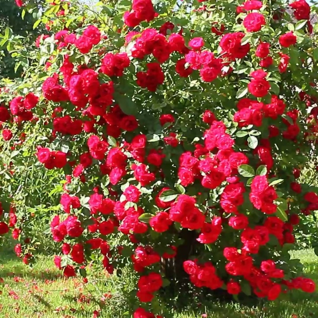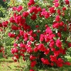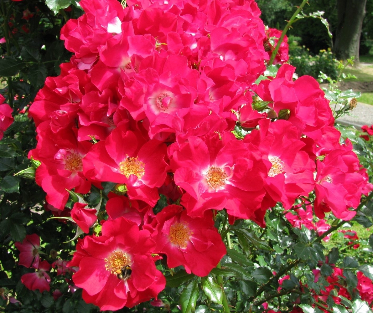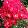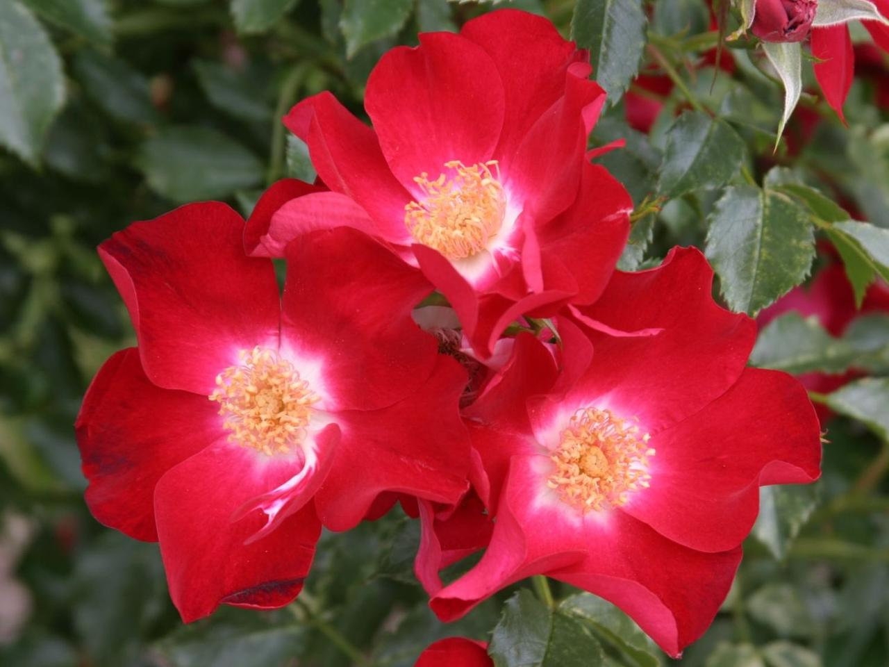 Эта роза – привлекающий к себе внимание невысокий клаймбер, покрытый крупными (11-12 см), открытыми, немахровыми цветками с легким ароматом в крупных кистях. Они яркого, красивого красного цвета с крупным белым пятном в центре и пучком ярко-желтых тычинок. Листва блестящая, очень темная, устойчивая к заболеваниям. Куст ветвистый, достигает 3 м.