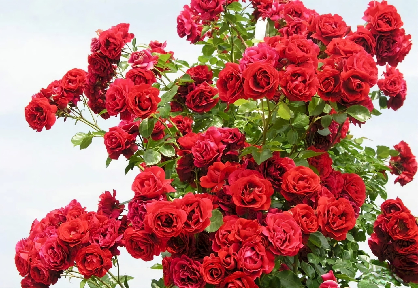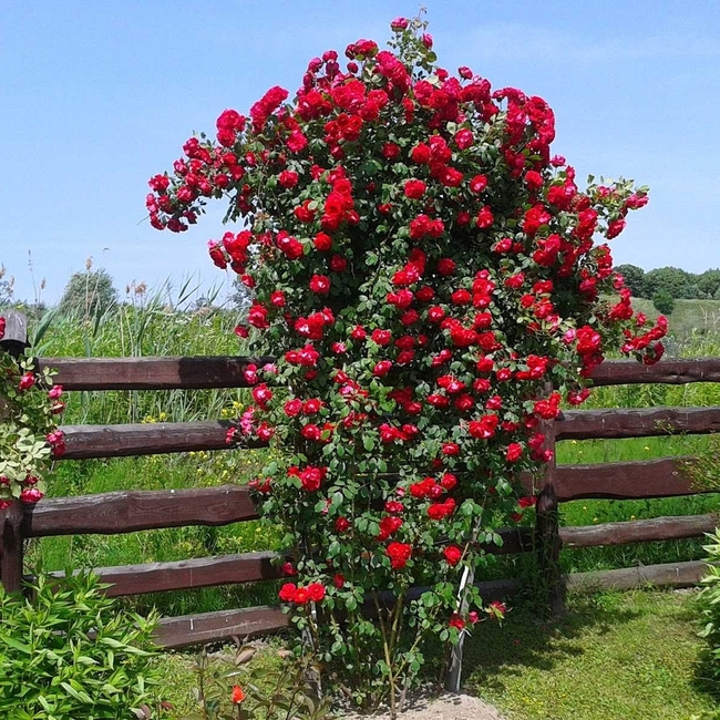 Этот сорт цветет кистями слегка ароматных кроваво-красных цветов, каждый состоящий из около 20 лепестков. Цветки довольно крупные, чашевидные. Окраска очень темная и одновременно яркая, и цветки красиво выделяются на фоне ярко-зеленой блестящей листвы. Первая волна цветения обильная, следующие менее обильны. Куст сильный, быстро растет, вынослив.