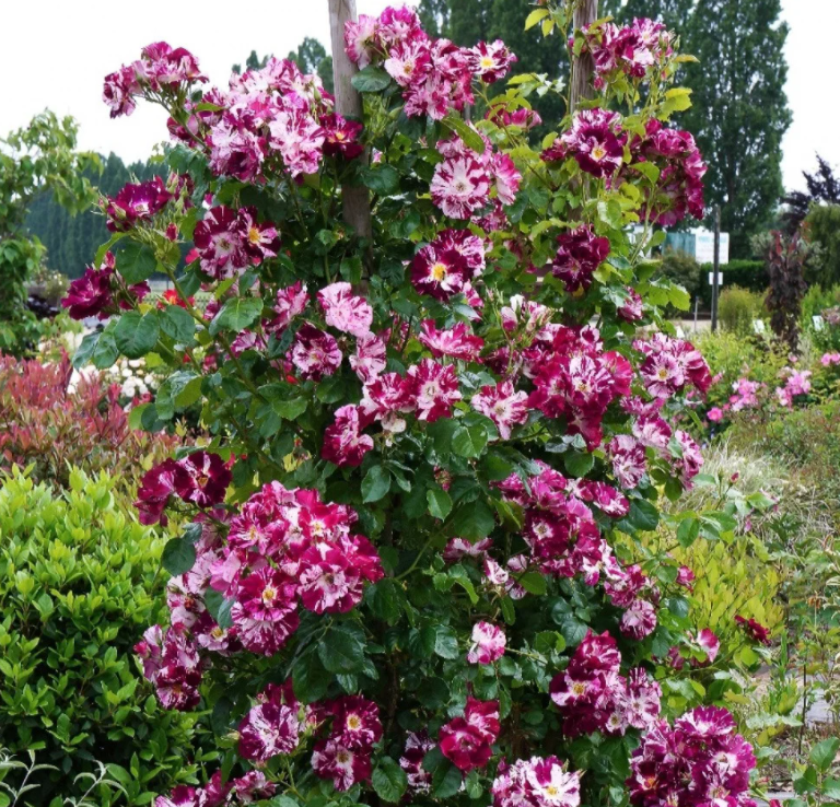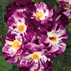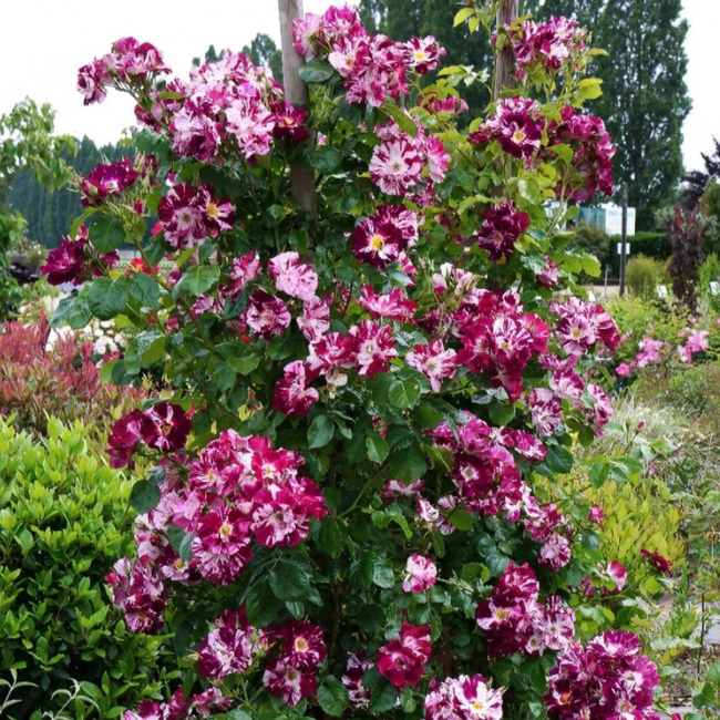 Цветы появляются в больших конических кистях по 10-15 цветков, имеют сладкий аромат с нотками яблока. Винно-пурпурные с сияющими белыми штрихами цветы эффектно выделяются на фоне глянцевой яблочно-зеленой листвы. Роза обильно цветет уже в год посадки, способна быстро создать "цветущую стену".