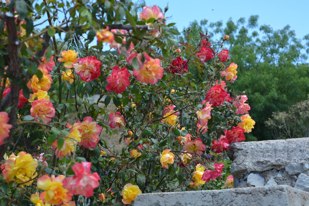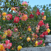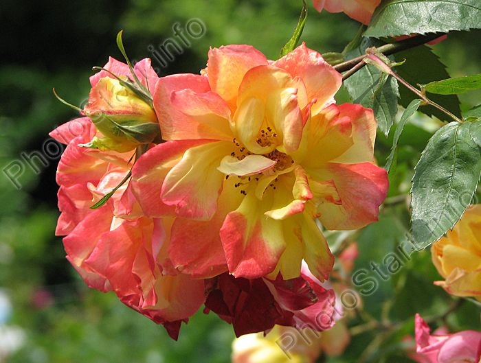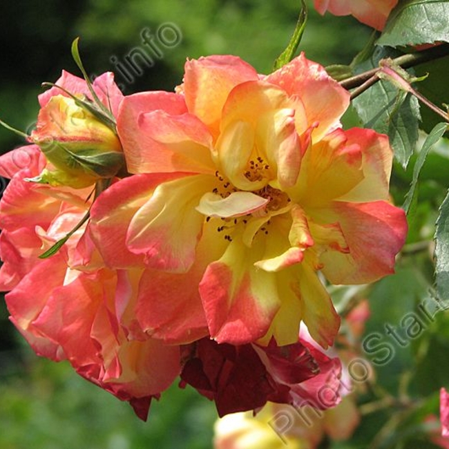 Цветки многоцветные, меняющие окраску в процессе цветения с желтой на оранжевую с розоватыми краями лепестков, а затем на красную с белым глазком в центре, чашевидные, крупные (до 11 см), махровые (до 30 лепестков), чаще в соцветиях (до 7-10 штук), с сильным чайным ароматом. Листья темно-зеленые, с бронзовым оттенком, оригинальной удлинѐнной формы.