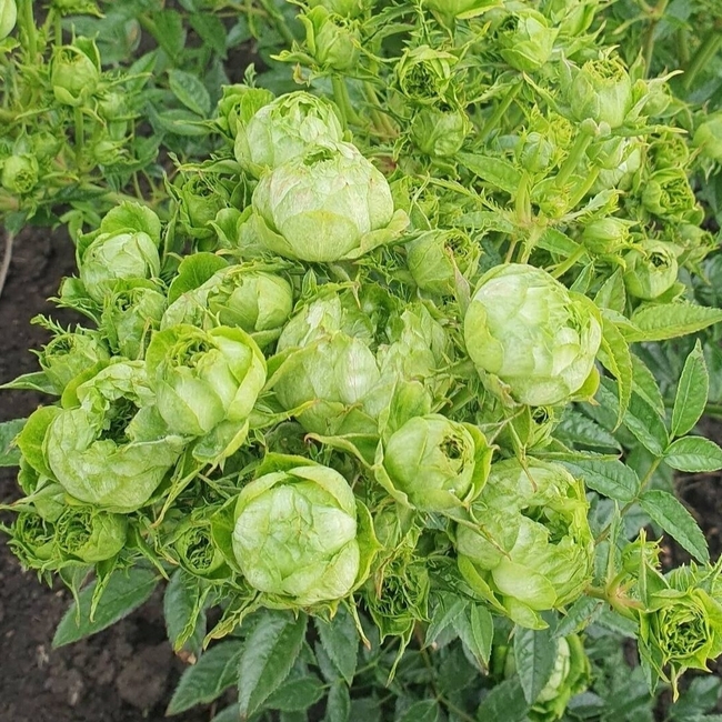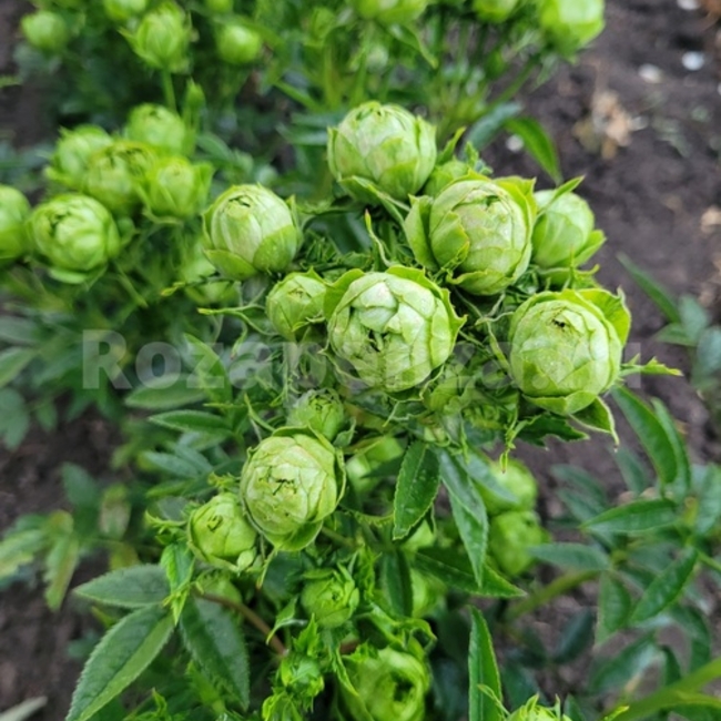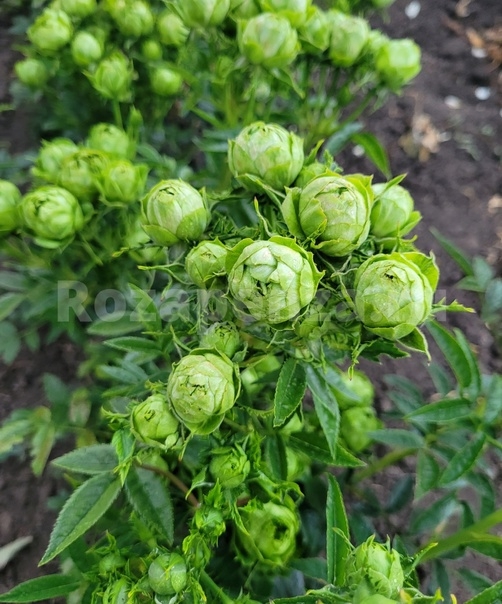 Сорт ярко-зеленой садовой кустовой розы. Перекрывающиеся лепестки придают округлым цветкам текстуру поверхности, которая усиливает воздействие ее яркого, но универсального оттенка. На каждом стебле не менее четырех или пяти маленьких цветков роз уникального интенсивного зеленого цвета.