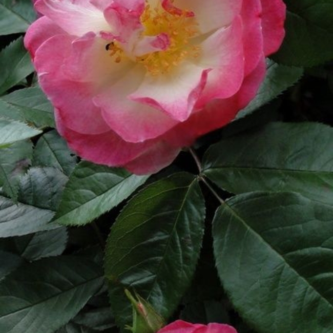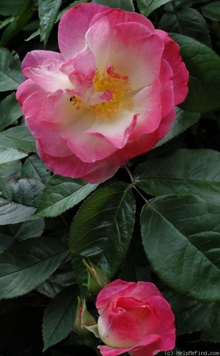 Цветки большие, простые и полумахровые, розовые с кремово-жёлтыми оттенками, кремово-белым центром и коричневыми тычинками. Аромат средний. Цветение повторное, до заморозков. Листва очень устойчивая к болезням. Побеги колючие. Куст плотный, высотой 100-150 см и шириной 120 см.