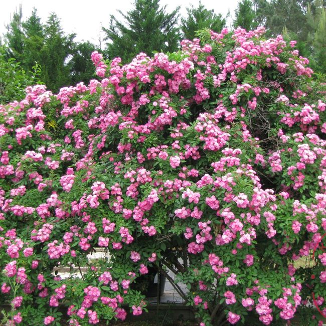 Ярко-розовые цветы собраны в большие душистые соцветия. Роза цветет очень обильно. Кусты широкие и высокие. Растение очень выносливое.