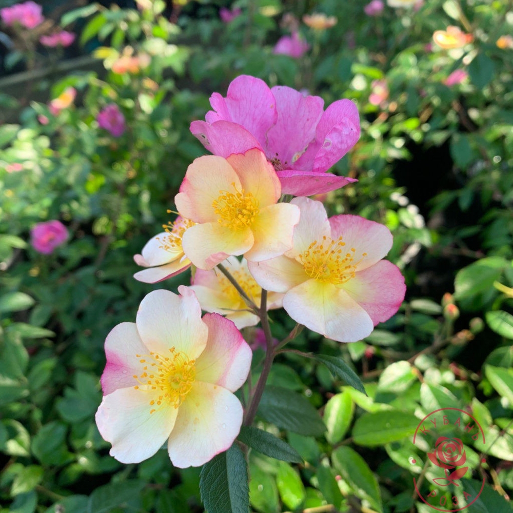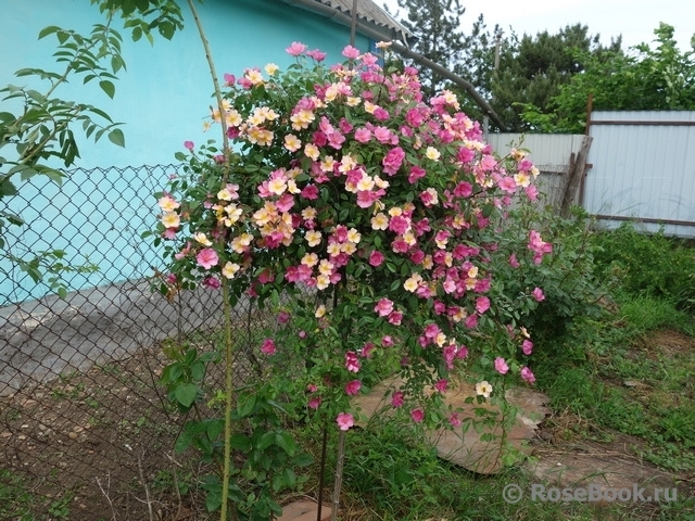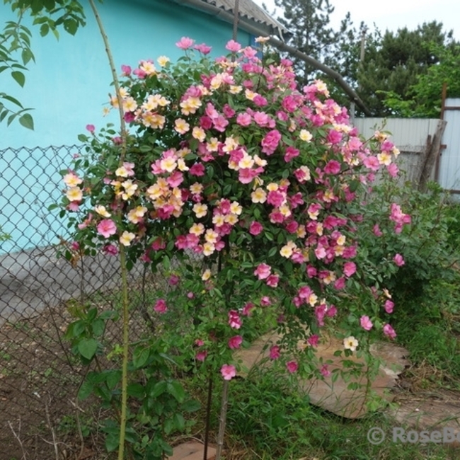 Результат скрещивания розы сорта Trier и R. chinensis 'Mutabilis'. Оранжевые бутоны раскрываются в немахровые цветки, вначале желтые, позднее розовеющие, в полном роспуске малиновые с пурпурным тоном, ароматные. Сильнорослый, зимостойкий сорт. Молодая листва бордовая. Высота 150 - 180 см, при использовании в качестве плетистой розы может достигать 3 м.
