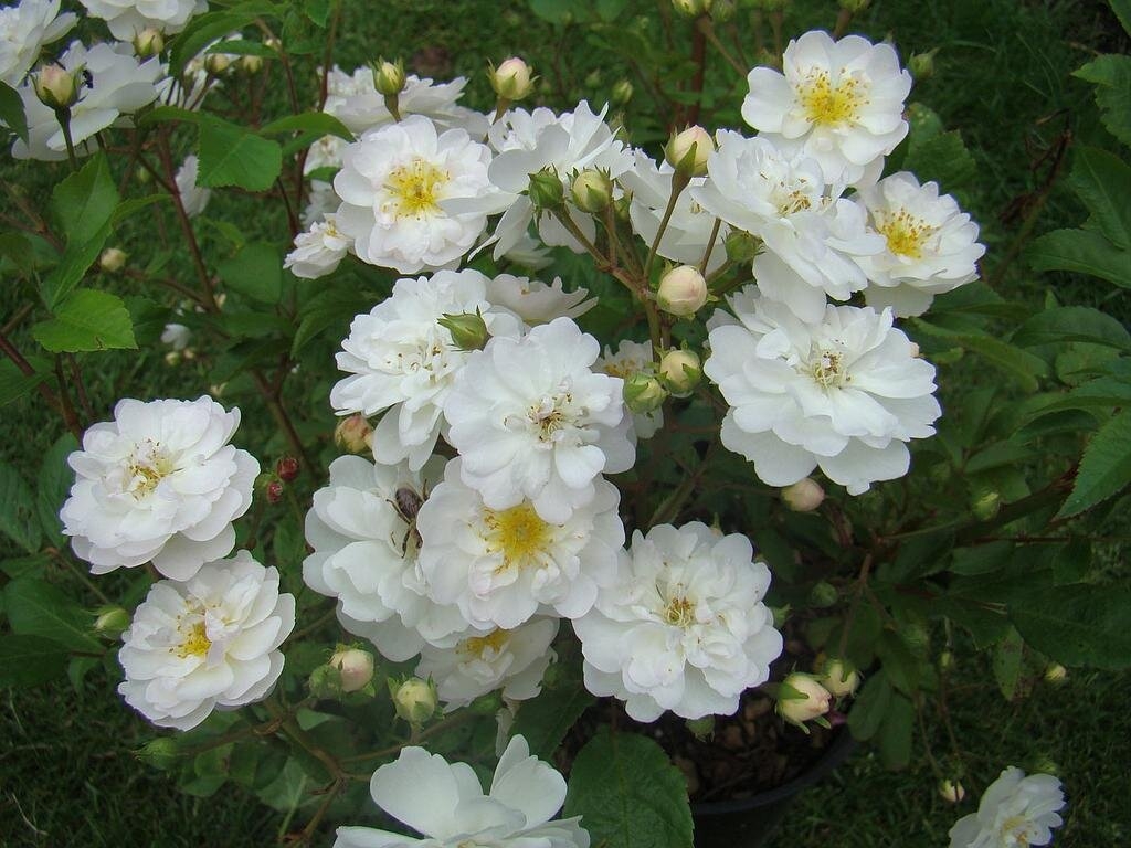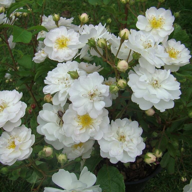 Назад Next Нет в наличии 400 Непрерывно цветущий куст фонтановидной формы. Ароматные полумахровые белые цветки появляются в крупных пирамидальных кистях. Сорт можно использовать как невысокую плетистую розу. Вариации Цвет