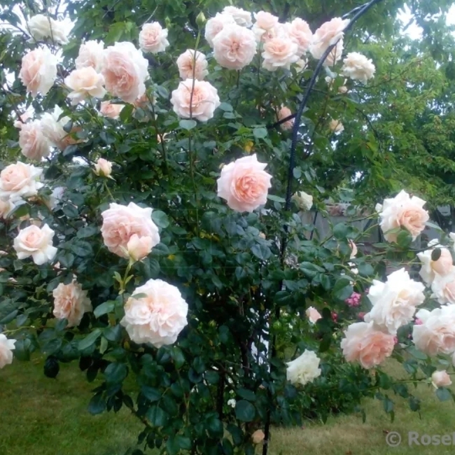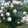 Penny Lane - первая из нового поколения плетистых роз Харкнесса с цветками старинной формы. Цветки крупные, махровые, очень красивые, с множеством лепестков. Они абрикосового цвета в центре, выгорают до цвета слоновой кости по краям. Появляются в небольших кистях по 3-5 шт. Роза цветет повторно, но это не самая обильноцветущая из плетистых роз. Листва темная, блестящая, здоровая, побеги изящные, их легко формировать.