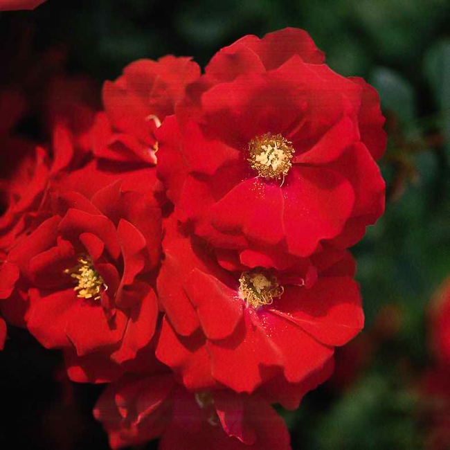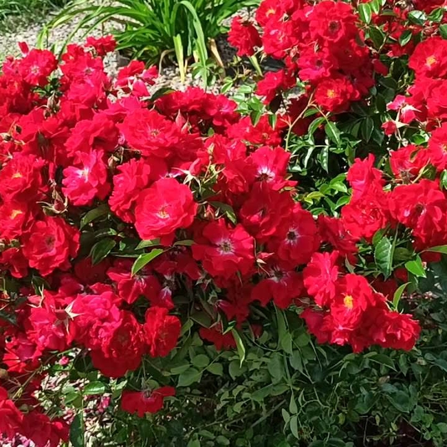 Очень обильно цветущая почвопокровная роза с тёмно-красными полумахровыми цветками диаметром 6-8 см, не выгорающими на солнце и не боящимися дождя. Аромата нет. Цветение поодиночке и в соцветиях, обильное,продолжительное, до заморозков. Листва тёмно-зелёная, глянцевая, с высокой устойчивостью к болезням.