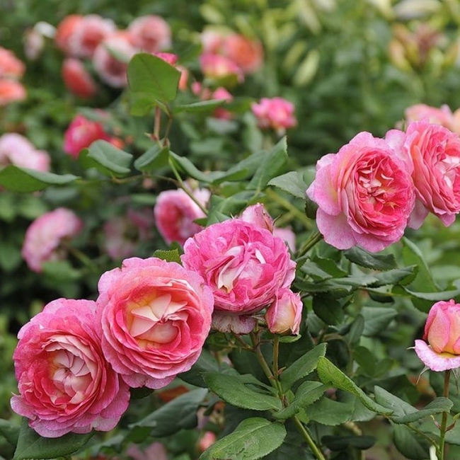 Цветок кораллово-розовый, с белой обратной стороной, старинной формы, густомахровый, округлый, квадратированный.