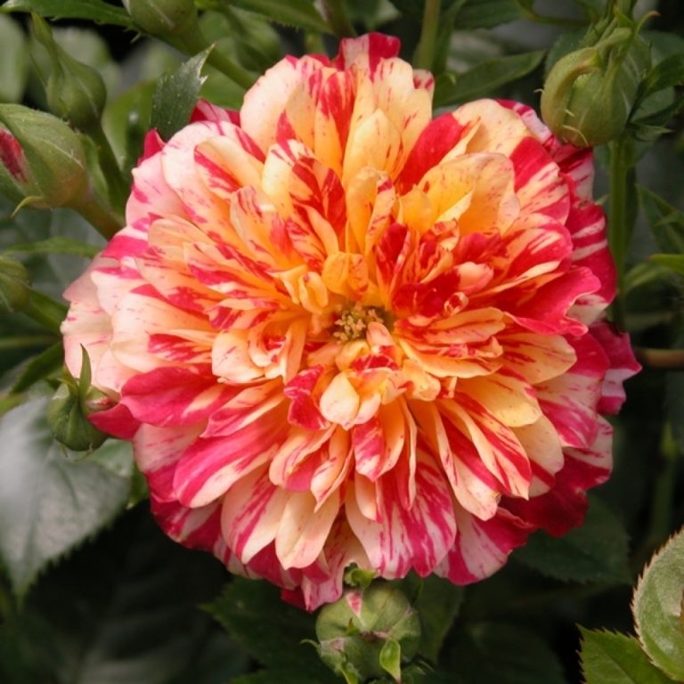 Роза - настоящее полосатое чудо для истинных гурманов Каждый лепесток розы Bigoudi - это фантастическое смешение двух разных цветовых оттенков. Цвета всего два, но они создают столько переходов, что вы просто не сможете найти на кусте двух одинаковых цветков! Красив и сам куст - он достаточно высокий и аккуратный, листва глянцевая, блестящая.