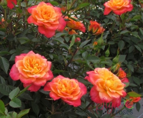 Цветки напоминают маленькие помпонные георгины, красивого цвета – смесь малиново-розового, лососевого и оранжевого, с более бледным центром и темными внешними лепестками и желтой оборотной стороной лепестков. Общее впечатление – мандариновый или апельсиновый цвет. Цветки появляются по одному или в небольших кистях, и покрывают растение снизу доверху.