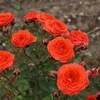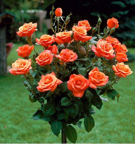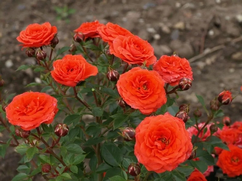 Высота куста, как правило ,составляет около 30-50 см. Ширина порядка 30-40 см.Цветки ярко-оранжево-красные, чашевидные, с рыхлым расположением заостренных лепестков, душистые, густомахровые - 26-40 лепестков, одиночные и в соцветиях, в полном роспуске показывают серединку с желтыми тычинками. Листья темно-зеленые, блестящие, кожистые.