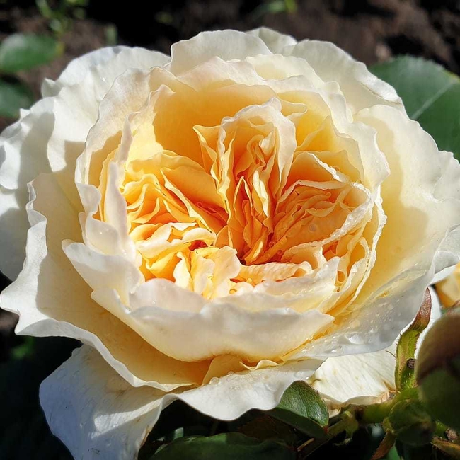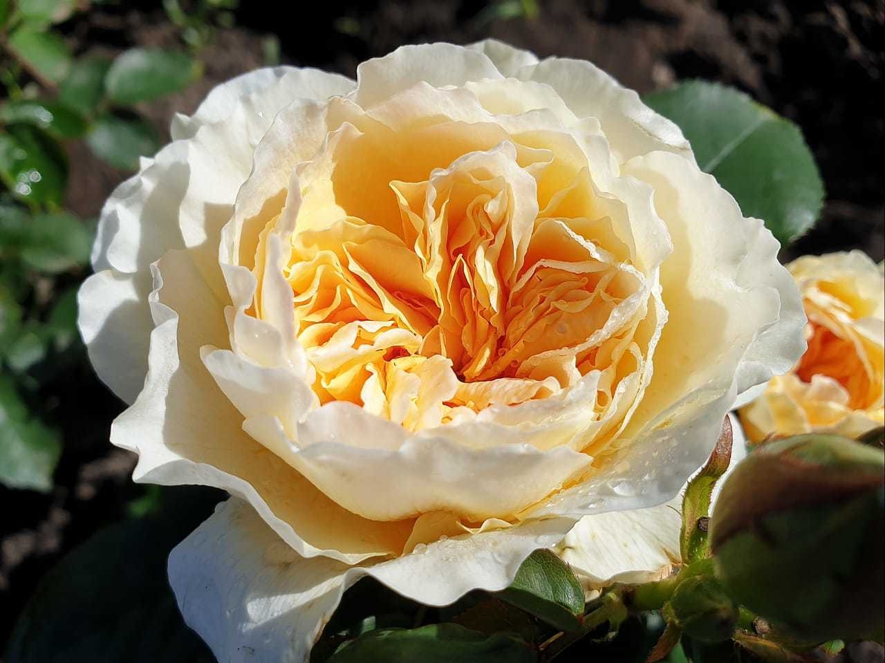 Цветы у розы густомахровые, желто-оранжевые цветки собраны в небольшие соцветия по 3-5 шт. Серединка с оранжево-абрикосовым оттенком. Диаметр цветки 7-10 см. Аромат очень приятный, фруктовый. Цветение очень обильное, цветет на протяжении всего сезона. Куст невысокий, компактный.
