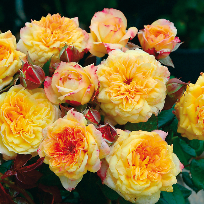 Желто-оранжевые цветки с розовым краем. Насыщенный ванильно-цитрусовый аромат. Цветки густомахровые, крупные, 11-12 см в диаметре, появляются обычно по одному, квартированные. Первое цветение обильное, затем более слабое. Куст ветвистый, прямостоячий. Листва блестящая, ярко-зеленая.