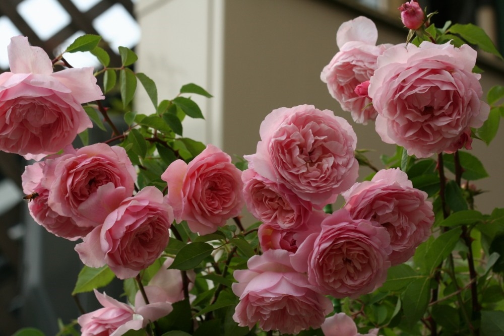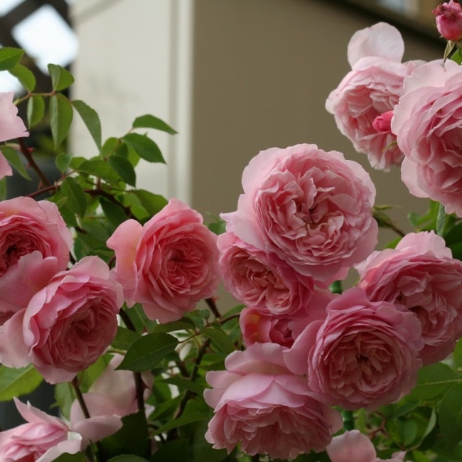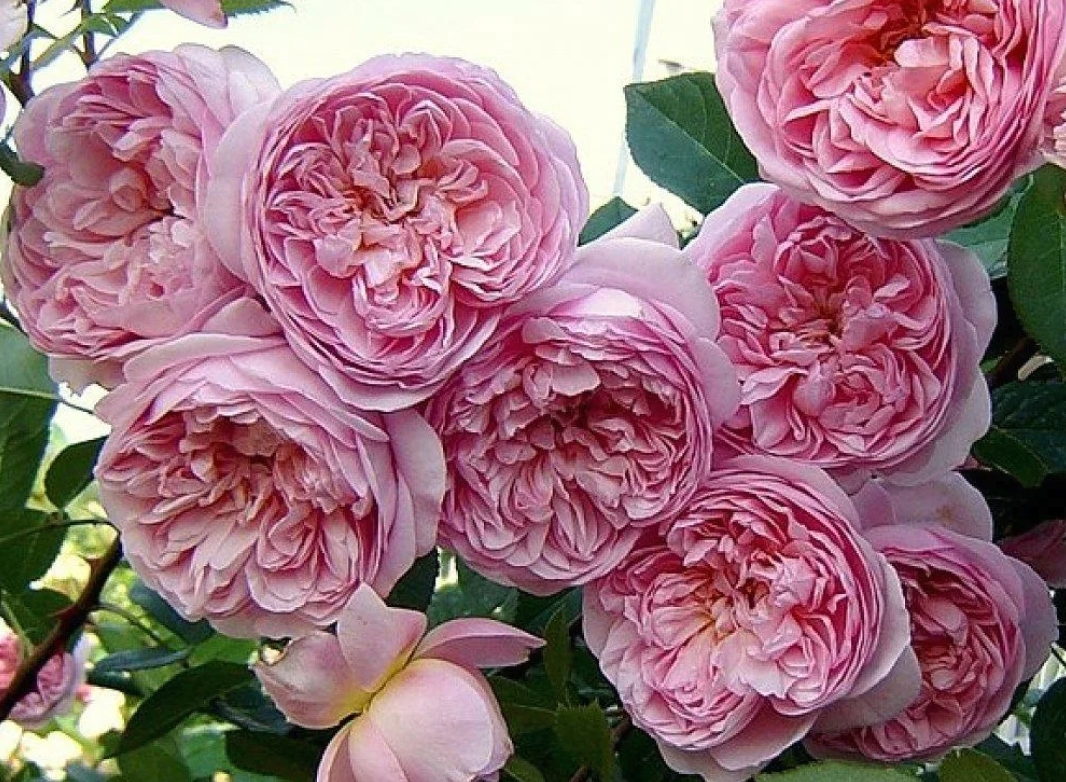 На гибких прочных светло-зеленых побегах появляются мелкие конусовидные бутоны. Розовые цветки с янтарным обрамлением распускаются в широкие шелковистые чаши, полные бесчисленных волнистых лепестков, часто квартированные. Аромат пьянящий, изысканный, с тонами чайной розы, груши, банана и меда.