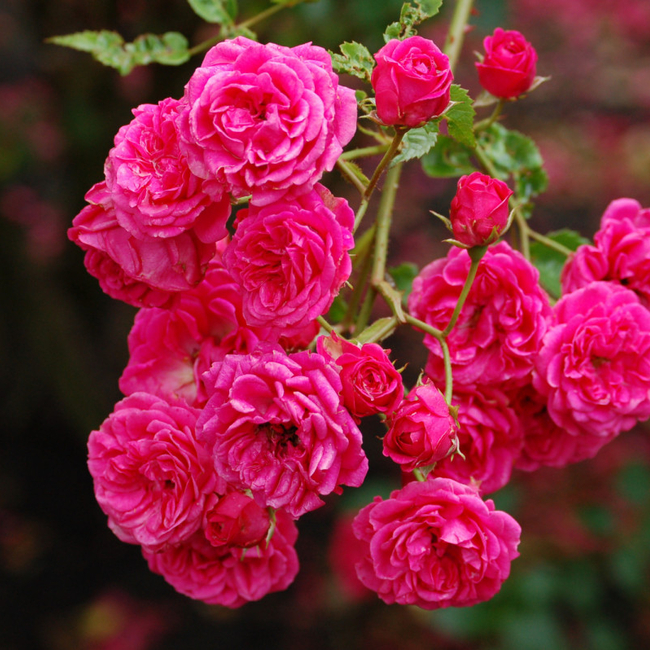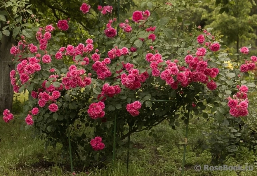 Цветки вначале бледно-малиновые, затем густо-розовые, в жару по краям выгорают до бледно-розовых. Они чашевидные, с массой коротеньких лепестков, позднее приобретают форму помпонов, и отличаются великолепным свойством чисто сбрасывать лепестки после отцветания. Появляются в прямостоячих рыхлых кистях по 10-20 шт. Листва темная, блестящая, куст очень сильнорослый.