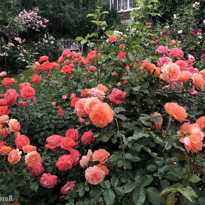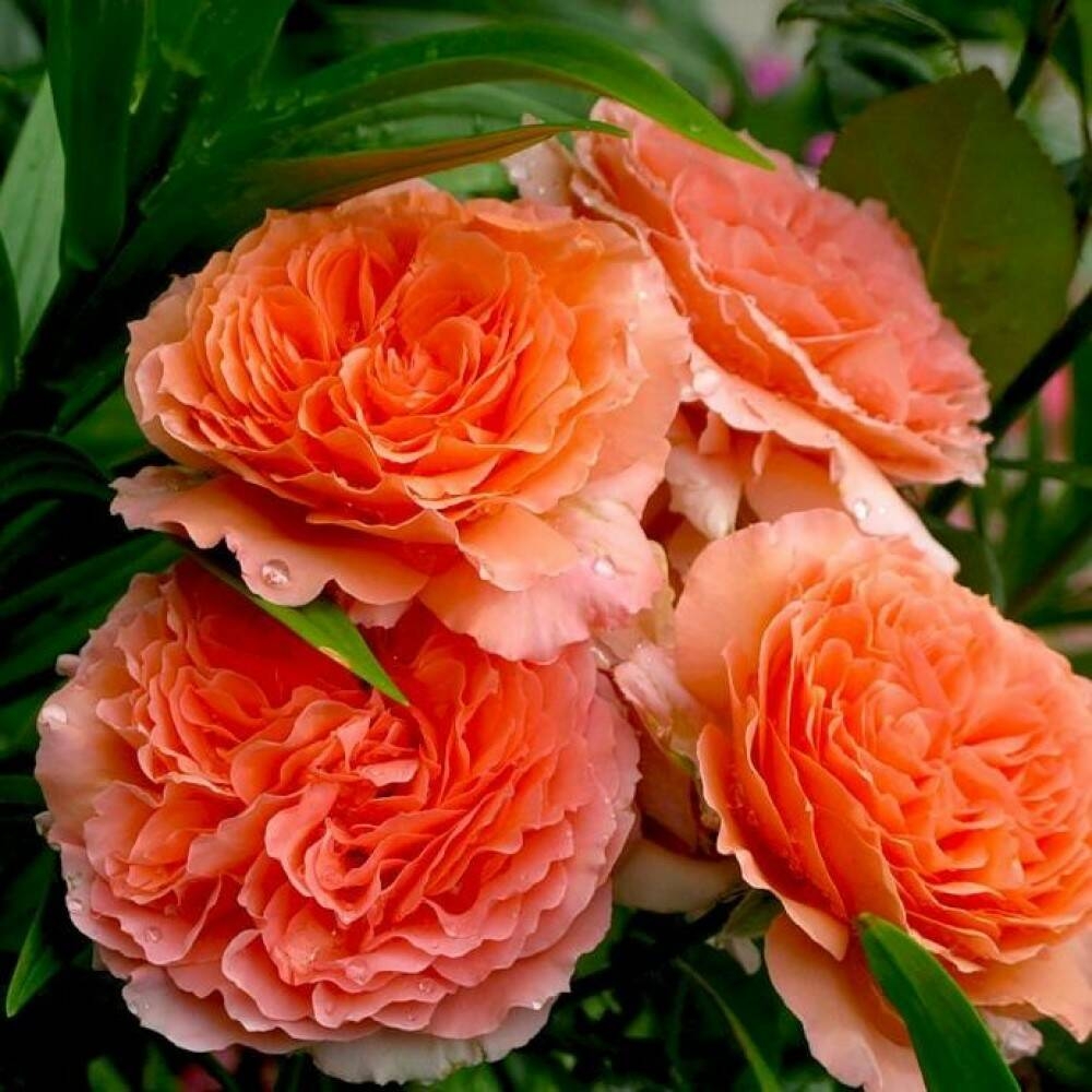 Цветки оранжево-персиковые, очень крупные, 10-12 см в диаметре, густомахровые, долго держатся на кусте, и великолепно сочетаются с темно-зеленой листвой. Не выгорают. Куст сильнорослый, аккуратный. Первое цветение обильное, за ним следуют более слабые волны цветения. Аромат терпкий.