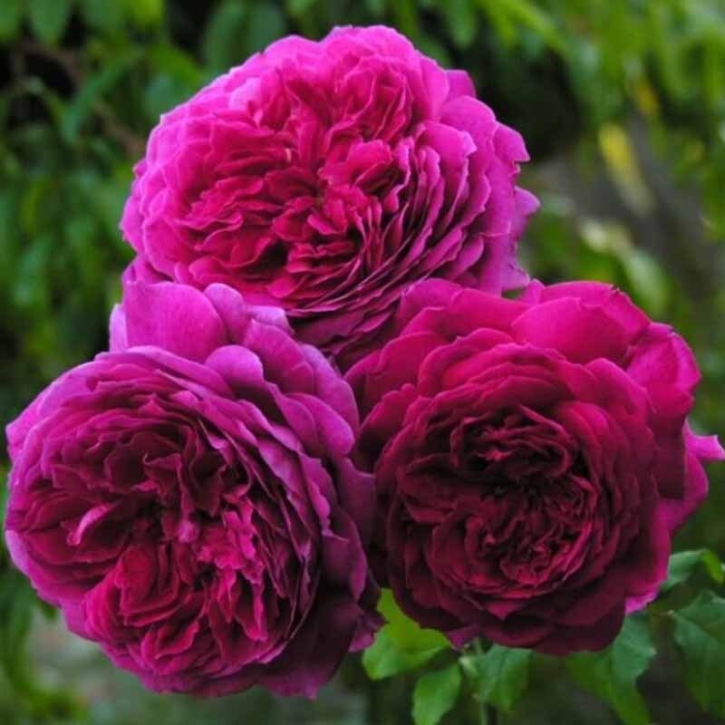 Цветки довольно крупные, глубоко чашевидные, даже в полном роспуске, с множеством мелких лепестков, уложенных с очаровательной небрежностью. Окраска необычна для английской розы: смесь густо-мажентового, розового и красного, внешние лепестки выгорают до светло-пурпурного, и все это контрастирует с серебристой изнанкой лепестков. Цветки изящно поникают, появляются по одному и в небольших кистях на мощных побегах. Аромат восхитительный.