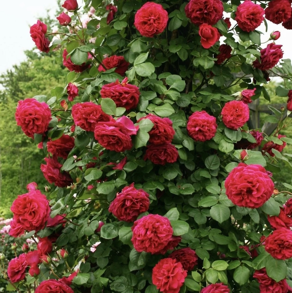 У этой розы крупные цветки красивого красно-малинового цвета. Они образуют розетки со свободно уложенными лепестками, закрученными в центре. Внешние лепестки со временем отгибаются вниз. Цветки появляются в огромном количестве, так что ветви под их весом часто гнутся до земли. Позже цветки не такие тяжелые, но также красивые. Приятно пахнут розовым маслом. Куст сильнорослый.