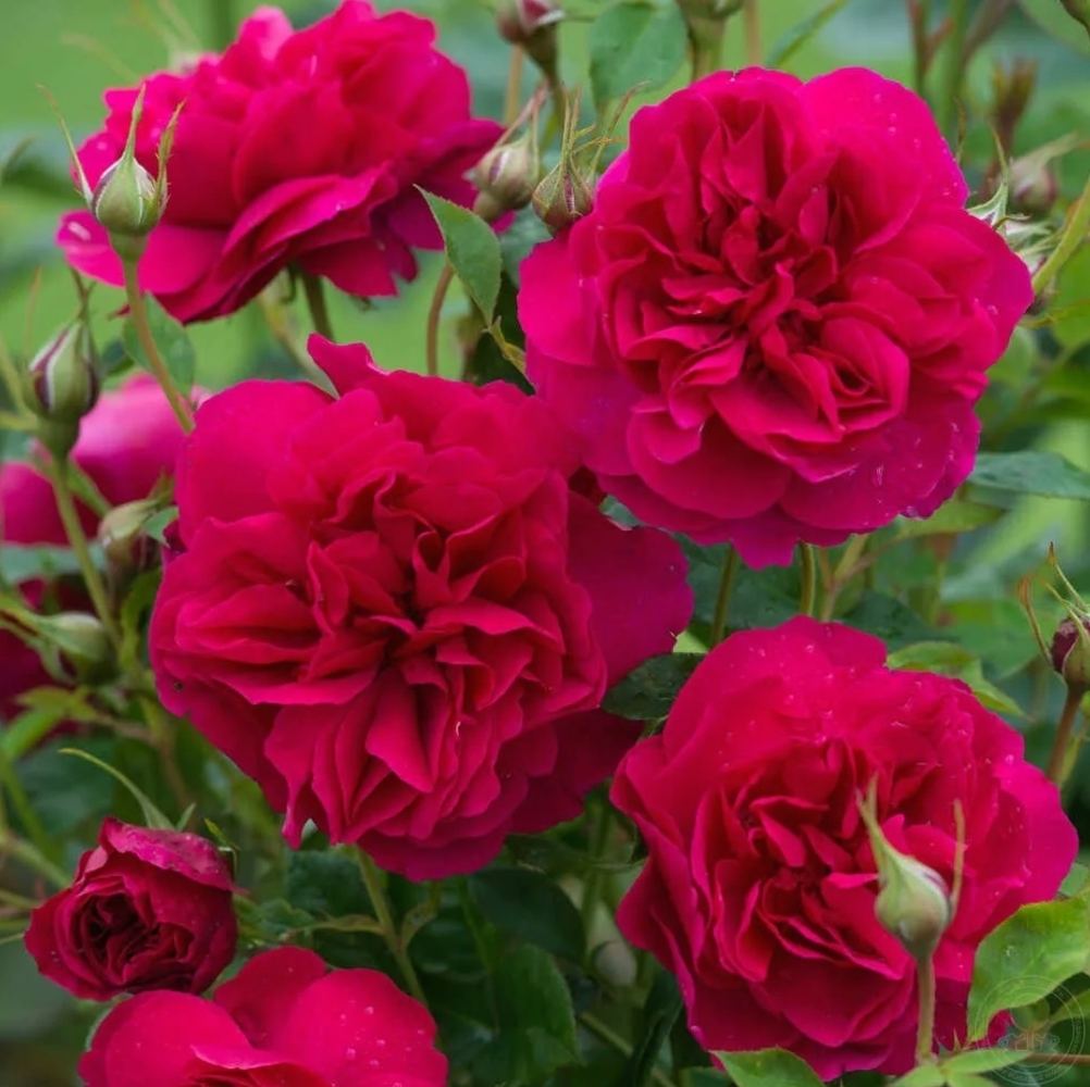 Цветки формы открытой чаши раскрываются в неплотные розетки с отогнутыми назад лепестками. Собраны в среднего размера кисти, отдельные цветки грациозно свисают на ветках. Цвет меняется от малинового к карминно-красному. Имеет аромат старинных роз с выразительными нотками лимона. Куст больше похож на видовую розу.