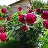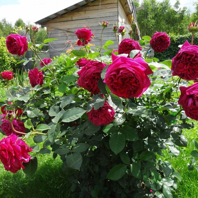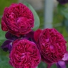 Цвет – великолепный темно-малиновый, вначале яркий и насыщенный, позднее выгорающий до блеклого пурпурного. Цветки чашевидные, лепестки короткие и закрученные, обычно образуют рыхлую розетку, но иногда могут быть квартированные или с пуговкой в центре. Появляются по одному или в плотных кистях до 5 шт на довольно длинных побегах, иногда цветоножки оказываются слабыми и тогда цветки поникают вниз. Листва темная.
