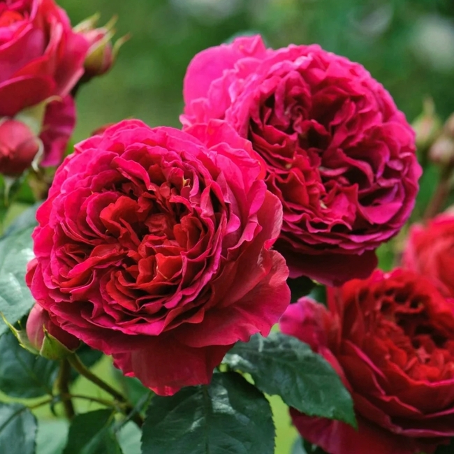 Крупные, красивые густомахровые цветки варьируют по цвету от гранатового до густо-малинового цвета. Куст прямостоячий, очень колючий, средней высоты. Округлые красные бутоны медленно раскрываются в темно-красные цветки. С возрастом они приобретают розоватый оттенок, однако общий тон остается насыщенно-красным. Цветки душистые, с сильным ароматом старинных роз.